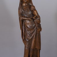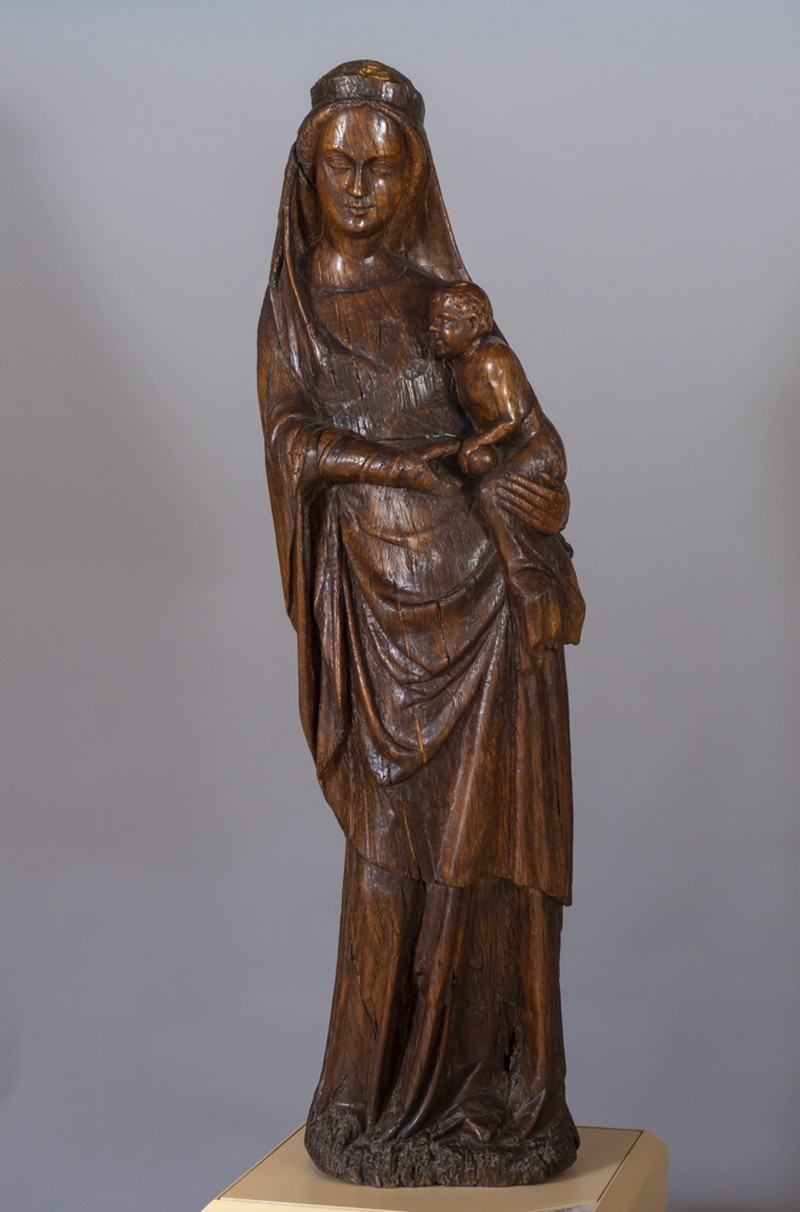 La Vierge, fortement déhanchée, a une silhouette gracile, allongée et élégante. Le drapé est traité avec beaucoup de finesse et reprend les compositions des Vierges appartenant à l’art « courtois » de la première moitié du XIVe siècle. La robe est rythmée par de longs plis obliques et recouverte par un tablier s’arrêtant horizontalement au niveau des genoux, marqué sur les côtés par des chutes de plis en volutes. Le visage de la Vierge est particulier : d’une forme ovale régulière, il a le front haut, des yeux légèrement étirés vers les tempes, proches du nez et la mâchoire forte. Les cheveux ne sont pas dessinés avec précision.