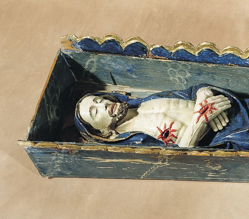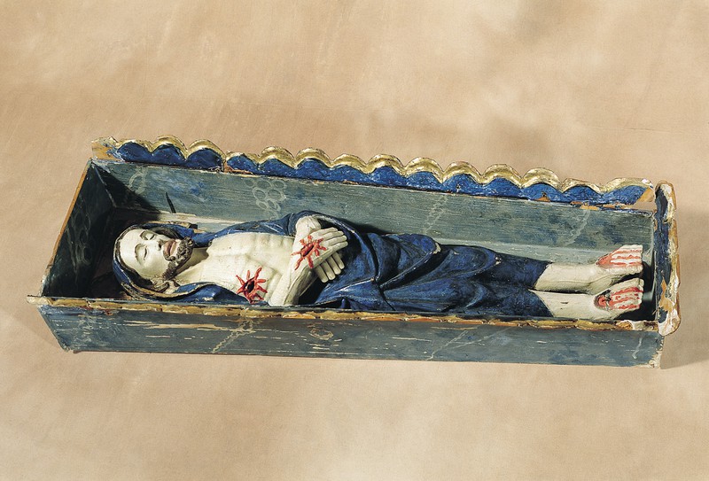 L’immagine del Cristo morto (Grabbild) era impiegata nei riti lturgici della Settimana santa, durante le celebrazioni della Depositio; in tale occasione la scultura veniva portata in processione fino all’altare e deposta in un sepolcro di legno o pietra. L'opera è composta da sette elementi: il corpo, la parte inferiore della gambe, gli avambracci con le mani e le dita dei piedi. L’opera è stata interessata da numerose ridipinture; la policromia attuale risale al XVIII secolo.