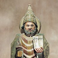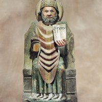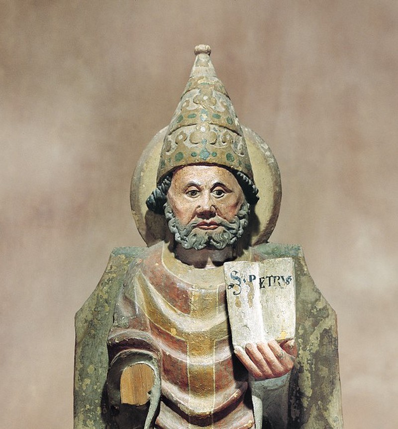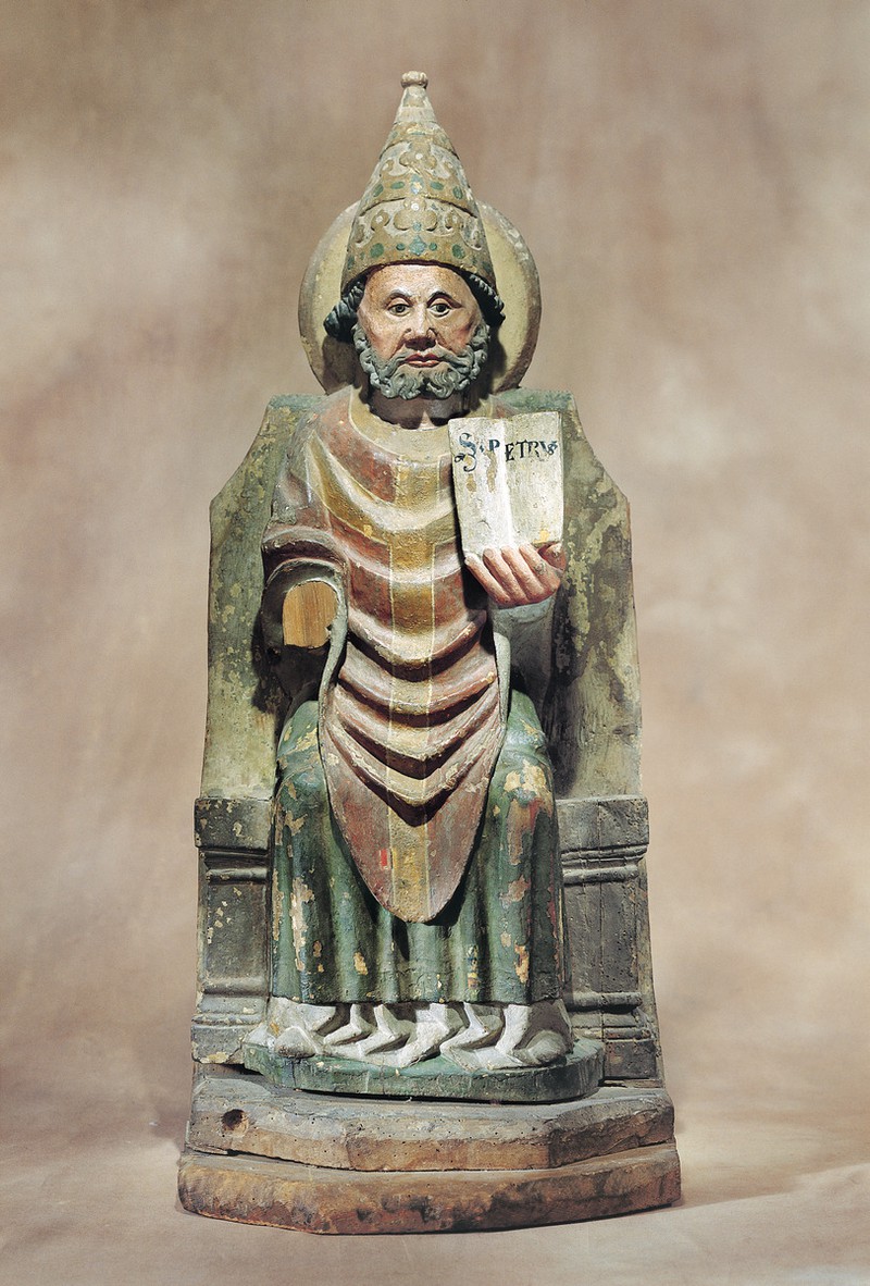 Benché la scultura sia stata a volte avvicinata alla Madonna di Vex in virtù della medesima origine, in realtà non ha in comune con essa che un solo particolare, il motivo delle gemme incastonate dipinte sulle corone; il San Pietro è infatti più recente del gruppo dell’Adorazione, che risale alla metà del XIII secolo. Rari sono i confronti con l’opera in esame; il San Pietro della chiesa di Mathenay (Jura), gli stalli di Géronde, databili entrambi al 1425-1430, mostrano uno stile gotico più accentuato, una preziosità che andrà sempre più raffinandosi. Le pieghe del manto di San Pietro, che si spezzano nella parte inferiore, preannunciano in qualche modo i rigidi panneggi della tunica del Pietro di Vex. La scultura dovrebbe essere di due o tre decenni più tarda rispetto a quelle di Géronde e di Mathenay, ma comunque anteriore al San Teodulo del Musée national, che, verso il 1500, mostra ancora il volto tipicamente “segnato” dei santi ecclesiastici.
